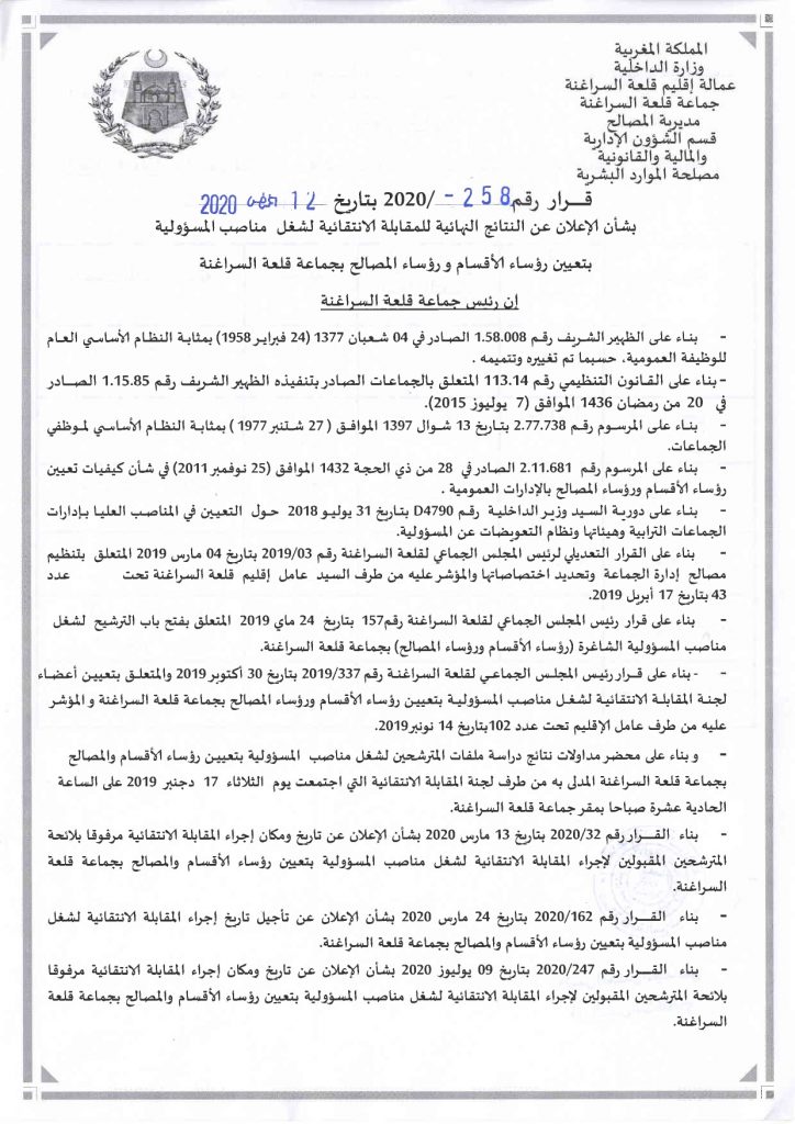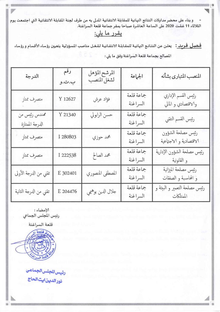 قرار الاعلان عن النتائج النهائية للمقابلة لشغل مناصب المسؤولية بجماعة قلعة السراغنة